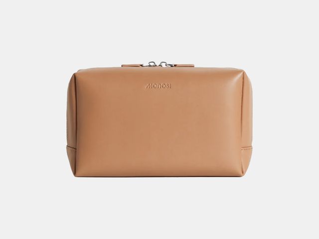 The Monos toiletry bag is made of nylon and vegan leather, which are both water-resistant. This durable case has three pockets inside that you can use to store your favorite items. hand cream, lip balm, The set includes a Q-tip set. The center compartment can easily hold your skincare essentials Standing up straight and organized.