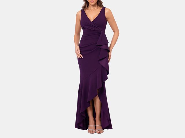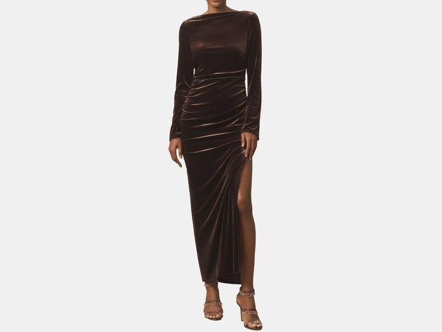 You have more freedom with your style if the couple you are celebrating asks for formal attire. You can still wear floor-length dresses that are elegant but have some fun with the color and details. Winter celebrations call for dark colors, festive jewel tones, and crushed velvet dresses—all of which are on-theme for New Year’s Eve weddings too. You might consider wearing a long-sleeved gown if the ceremony or pictures will be outside. Nordstrom Anthropology or Anthropologist