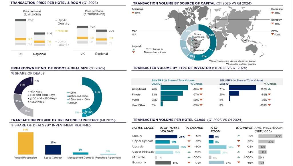 The UK hotel investment market saw record-high transaction volumes in 2024 primarily driven by major portfolio deals such as Edwardian & Village. Despite a 72% drop in Q1 2025, there were still 28 transactions, which is a record number. The Q1 volume of transactions in 2025 was dominated by institutional buyers, who accounted for 40%. This is a change from Q1 20,24 when private buyers dominated the market. The Upscale & Luxury segments led marginally in terms of market share (25% & 23%, respectively), though total volumes were down. In the future, it is expected that single asset transactions will dominate. This will be supported by an increased price alignment between sellers and buyers, and by fewer portfolio deals anticipated by year’s end.