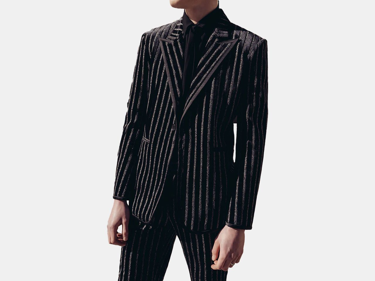 A man wears a black pin suit