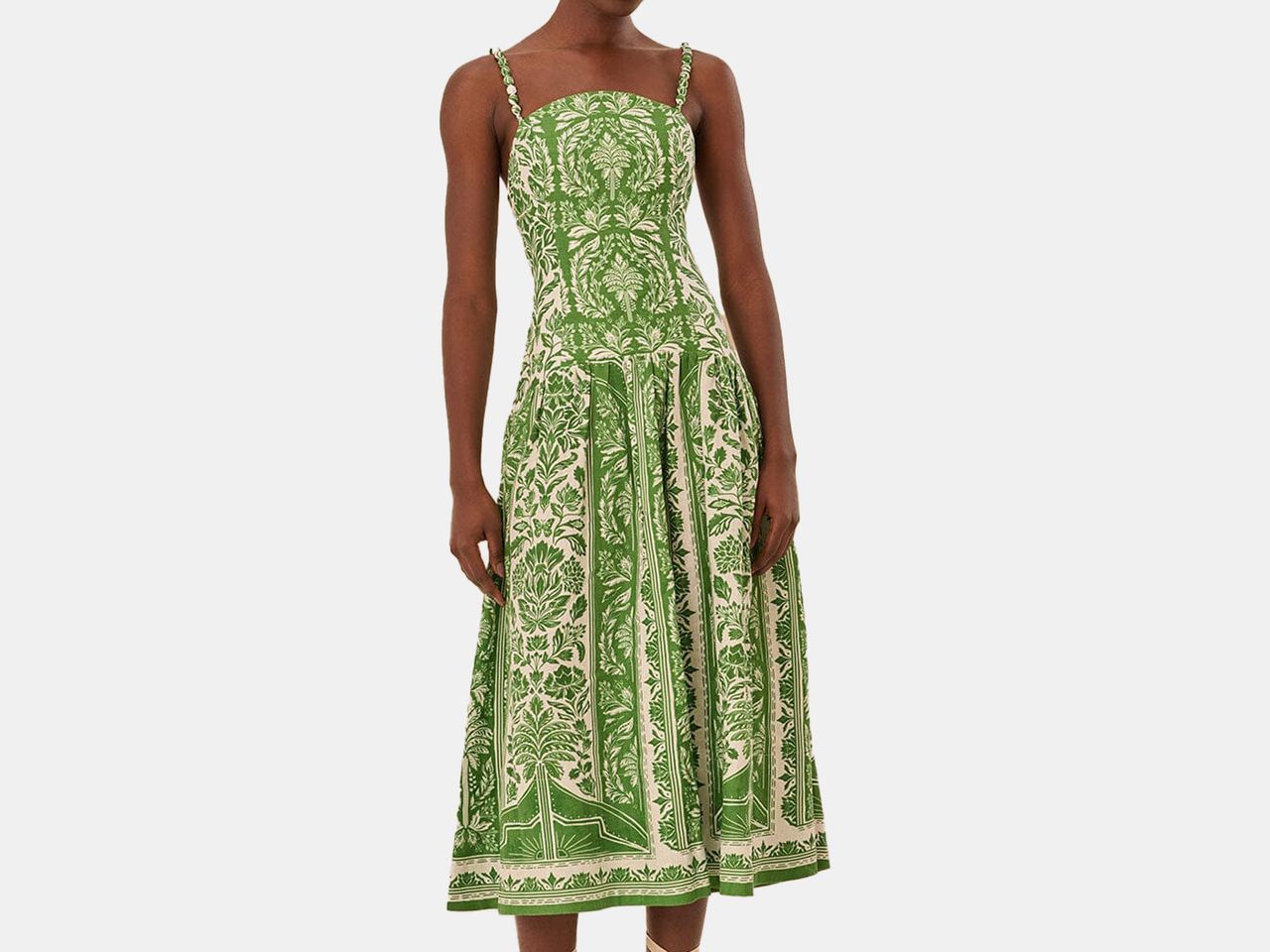 A woman wears a white and green dress